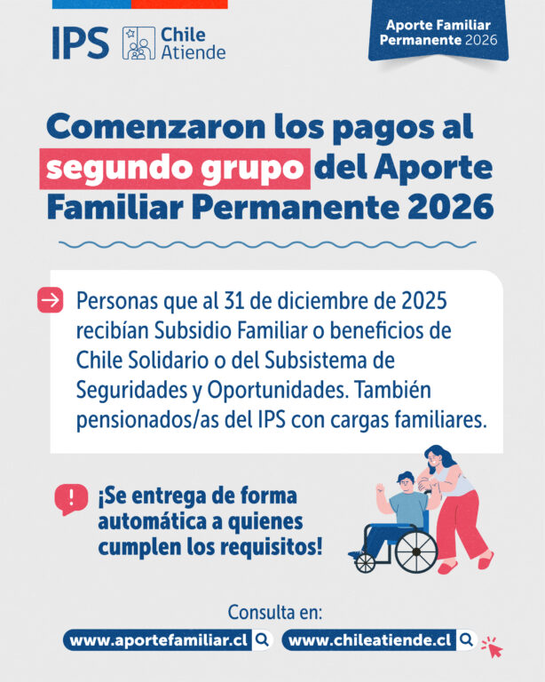 - Desde este 2 de marzo se comenzó a pagar el Aporte Familiar Permanente 2026 a la segunda nómina de beneficiarios.